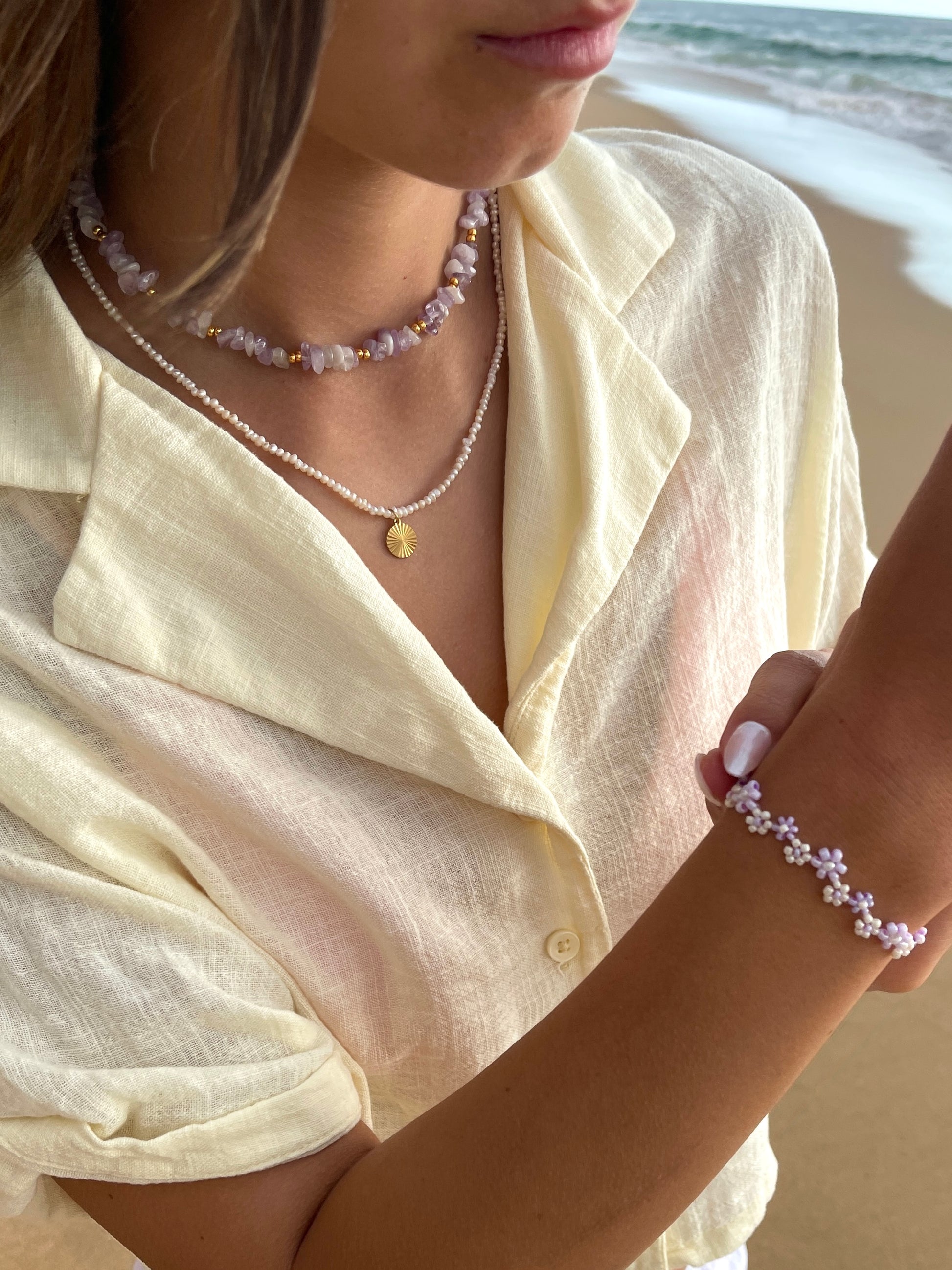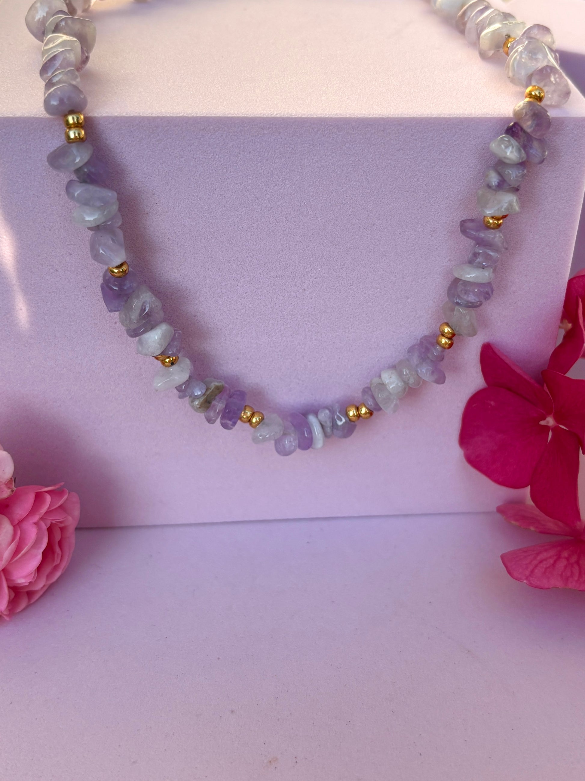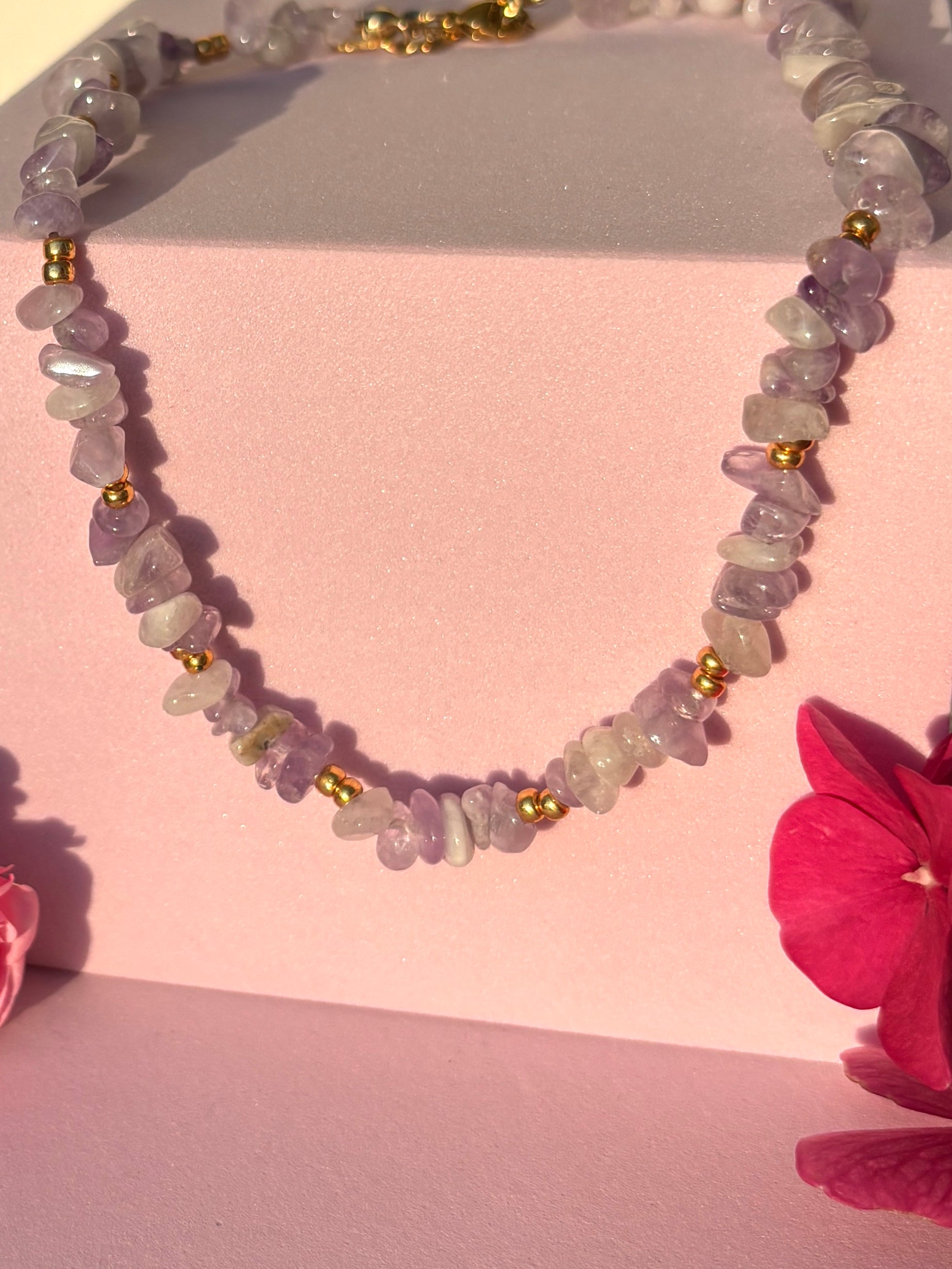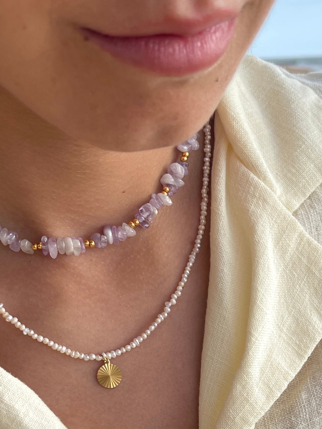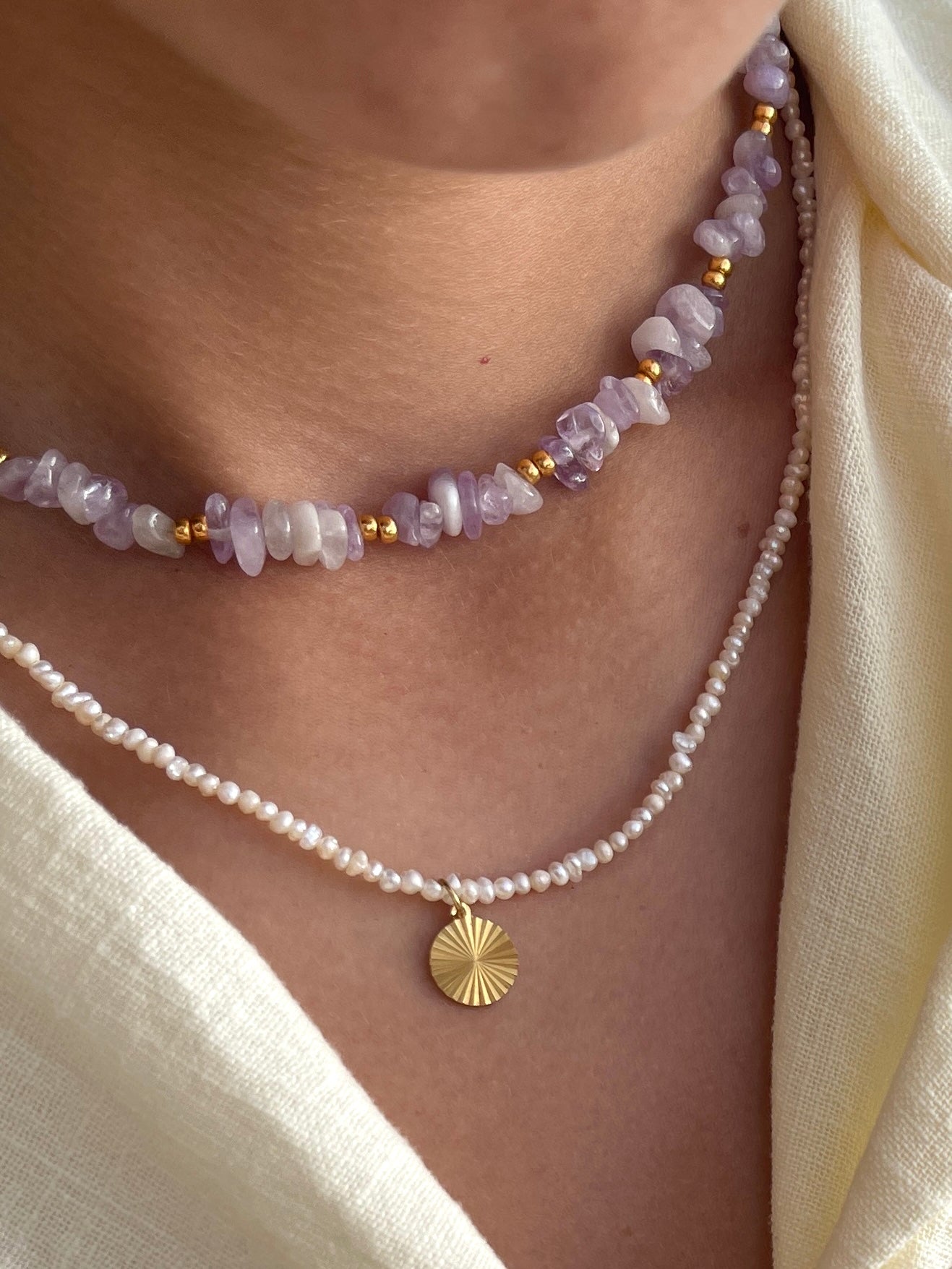 Erwecke deine Sinne mit dieser zarten, lilafarbenen Amethyst Kette. Perfekt für jeden Anlass verleiht sie deinem Outfit einen Hauch von Eleganz. Lass dich von der Schönheit der Natur inspirieren und fühle dich grenzenlos mit dieser Kette!