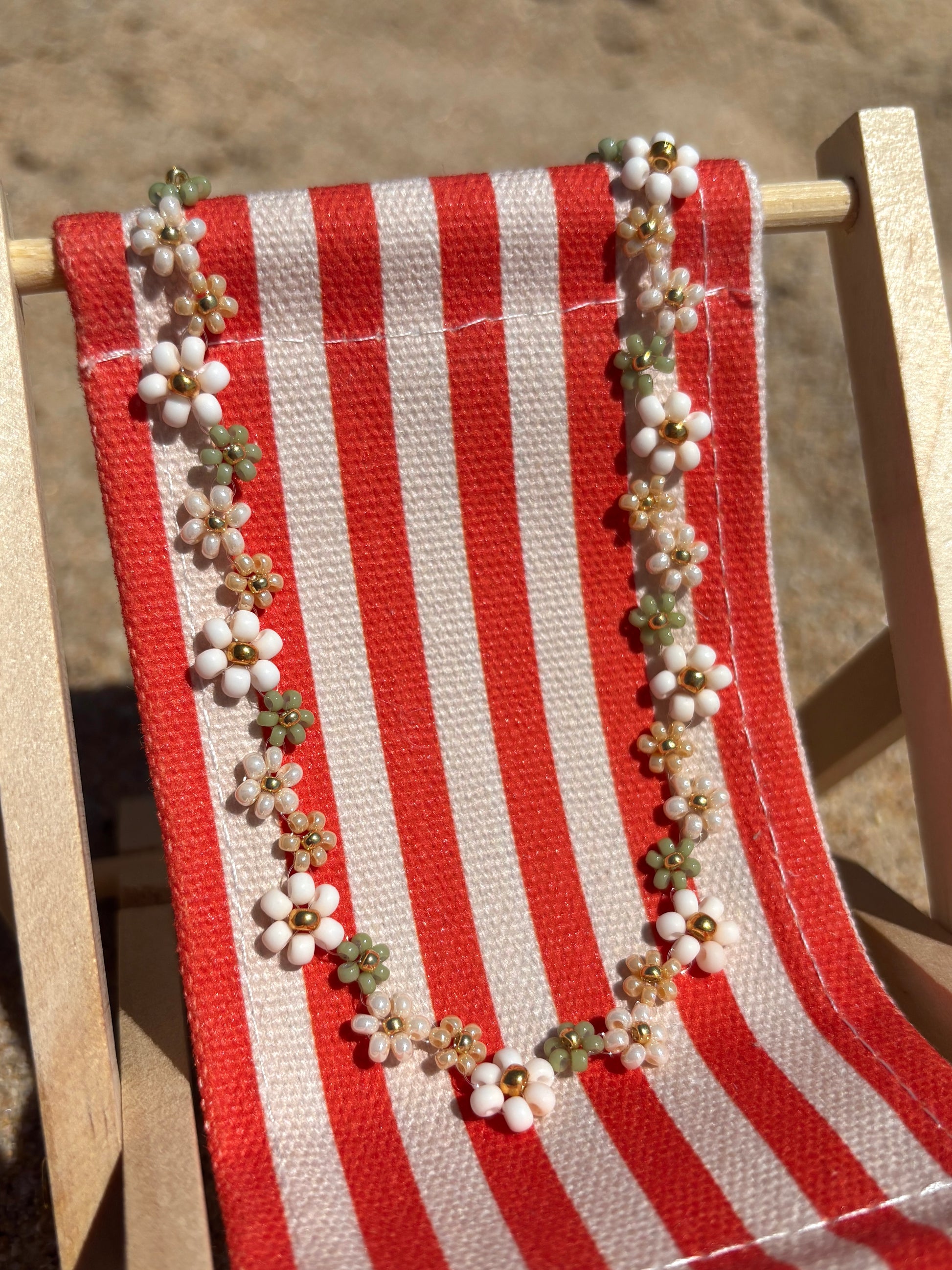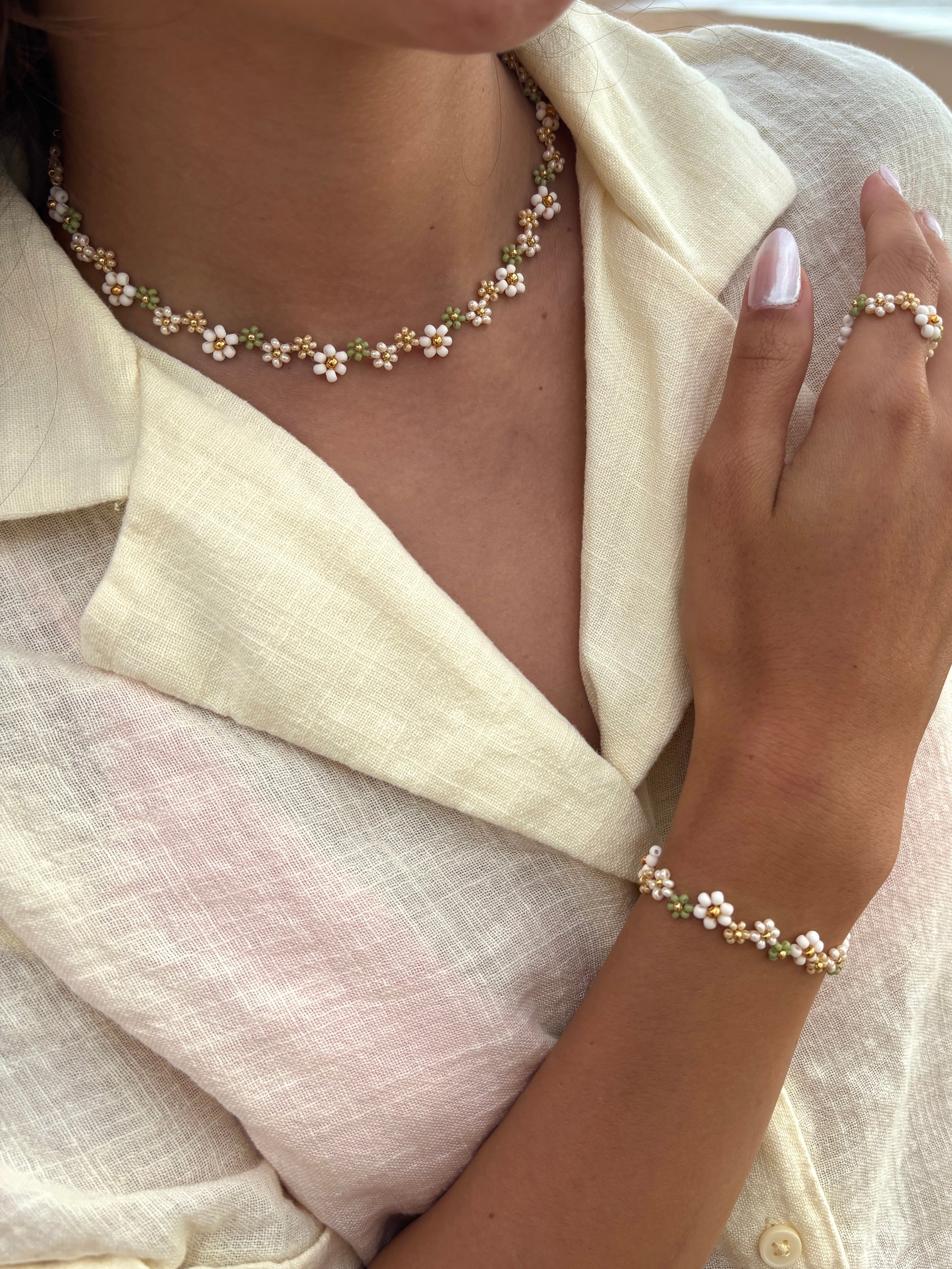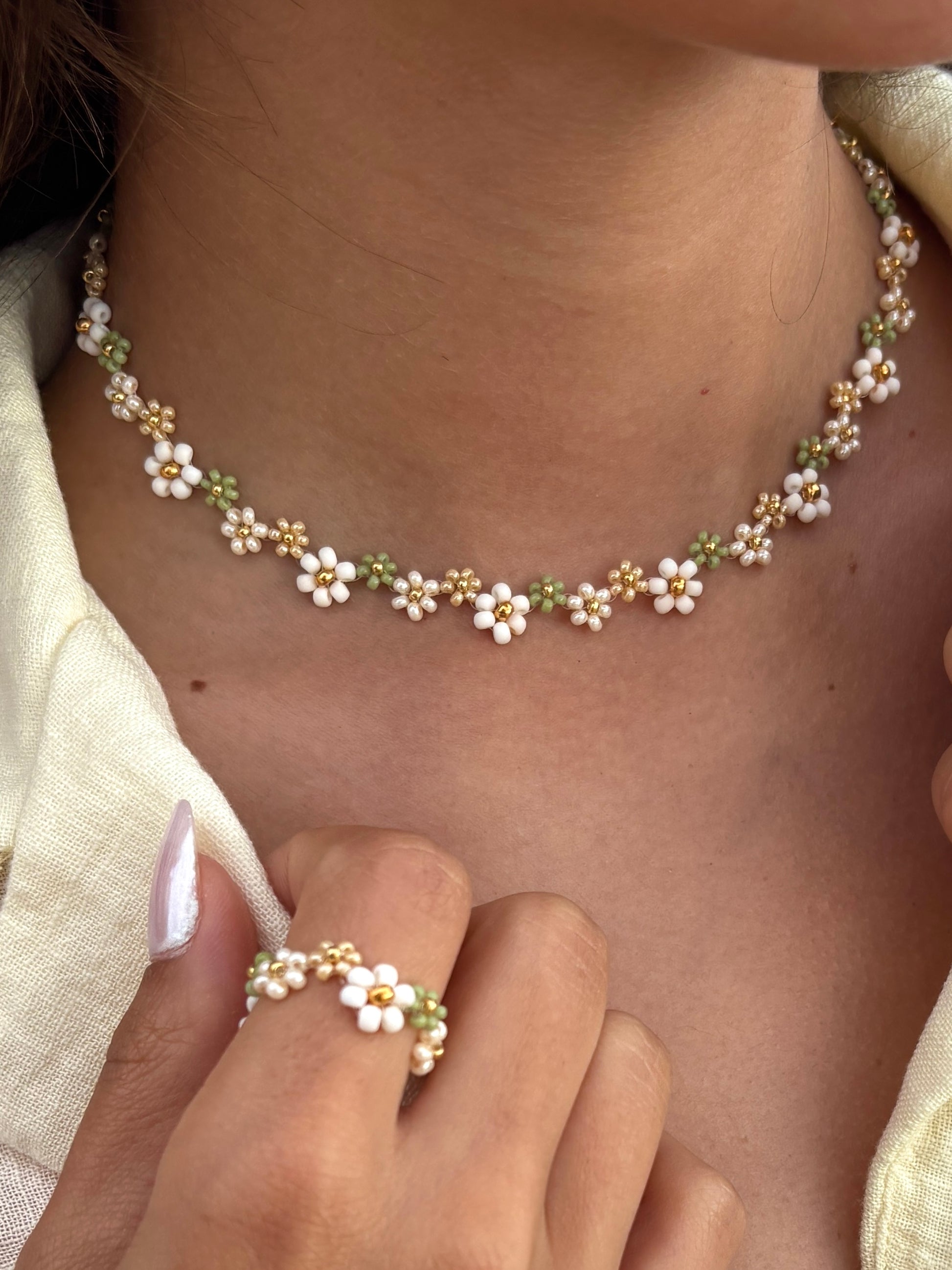 Die Ivy Kette mit ihren wunderschönen Perlen-Blumen in Naturtönen, ist perfekt für alle, die ein Akzent setzen möchten. Schmücke dich mit natürlichem Charme!