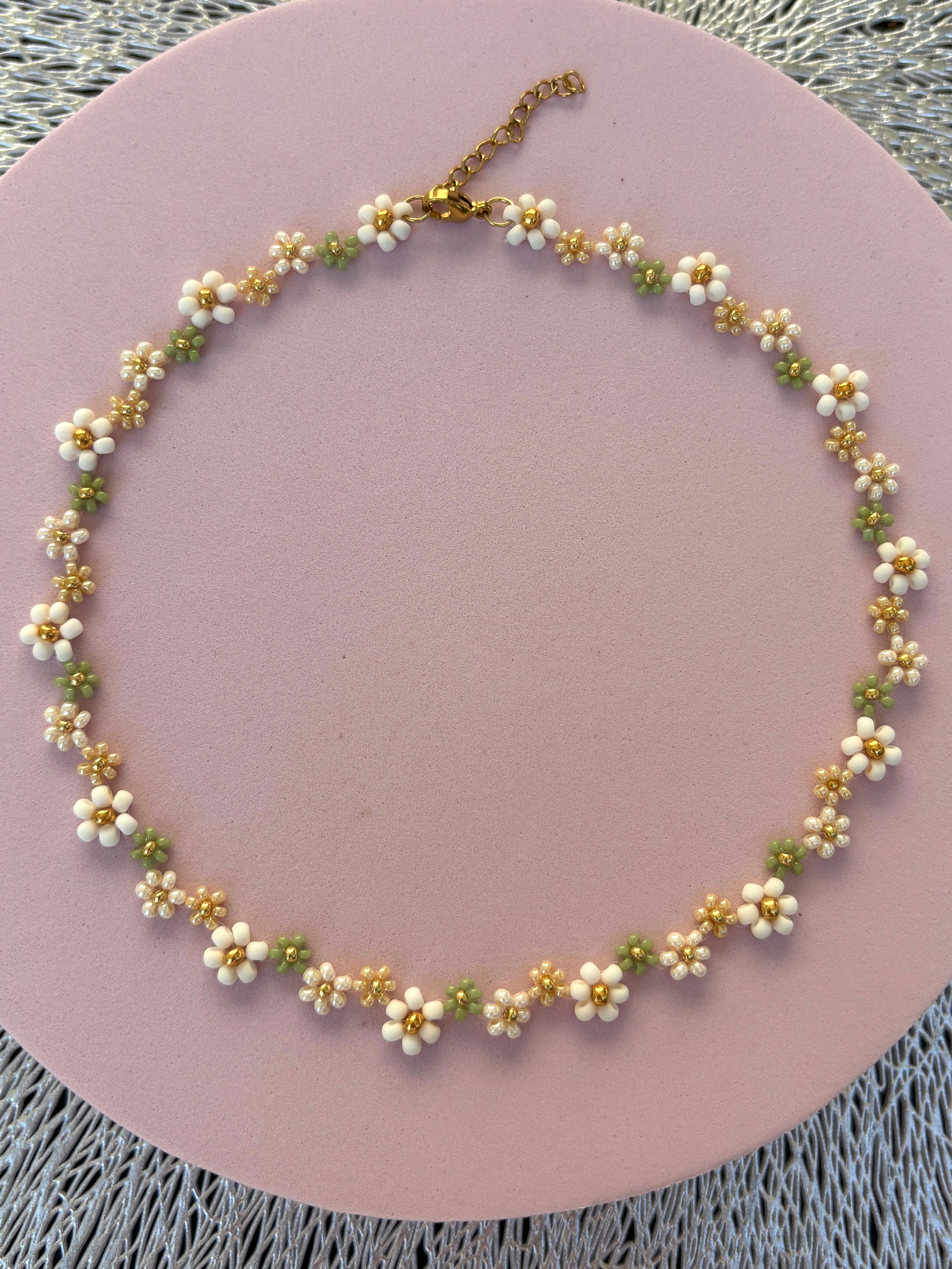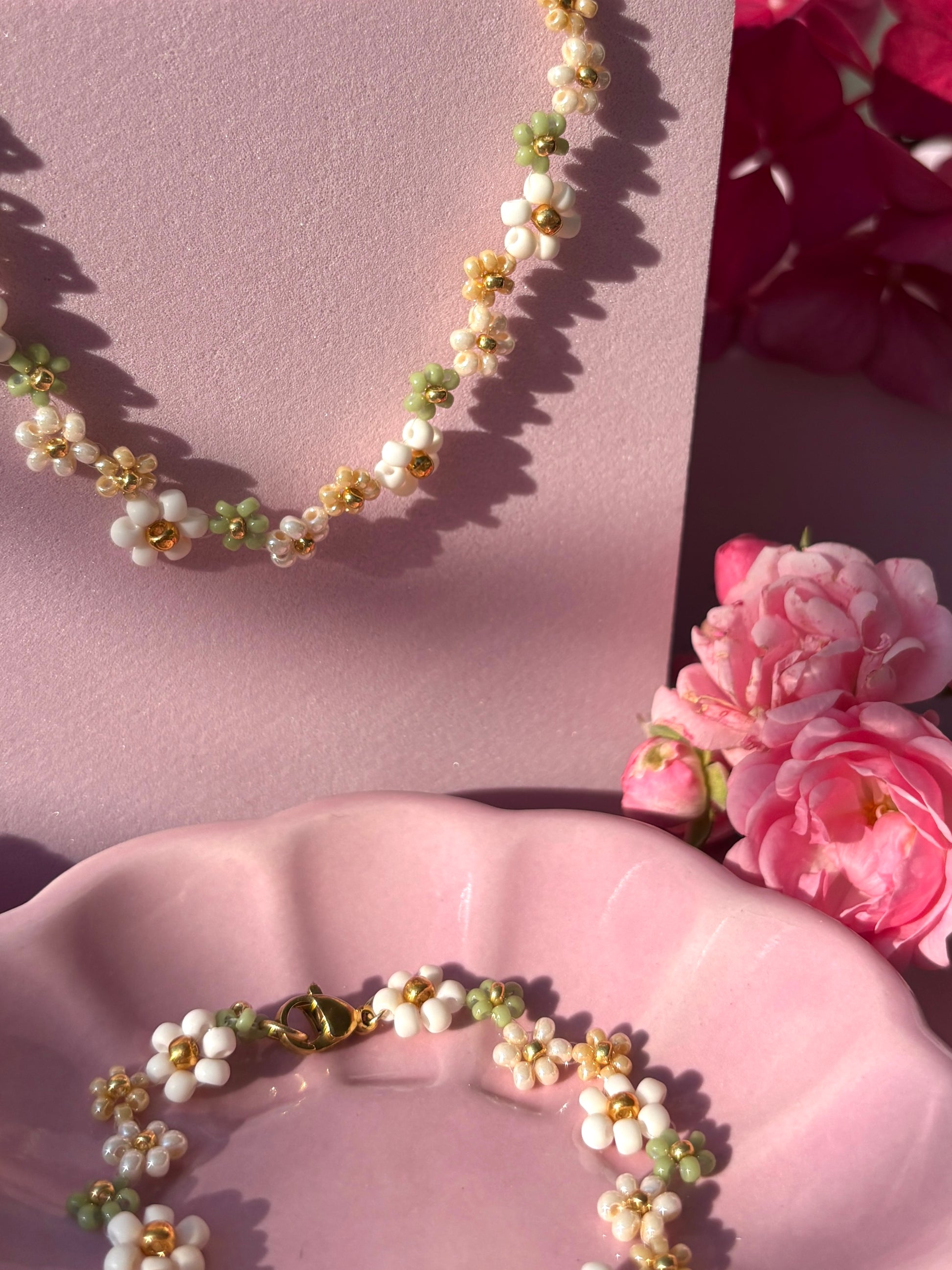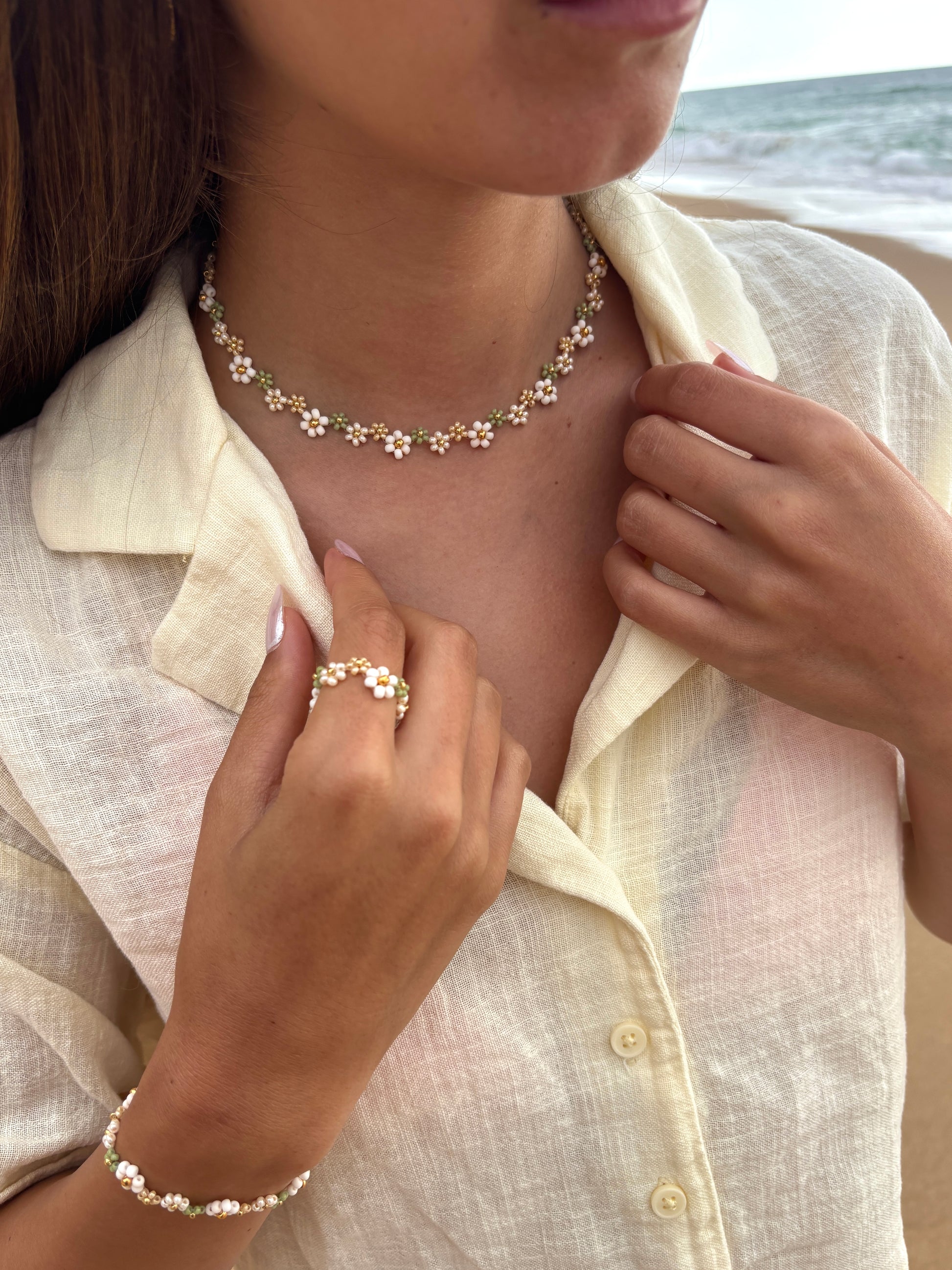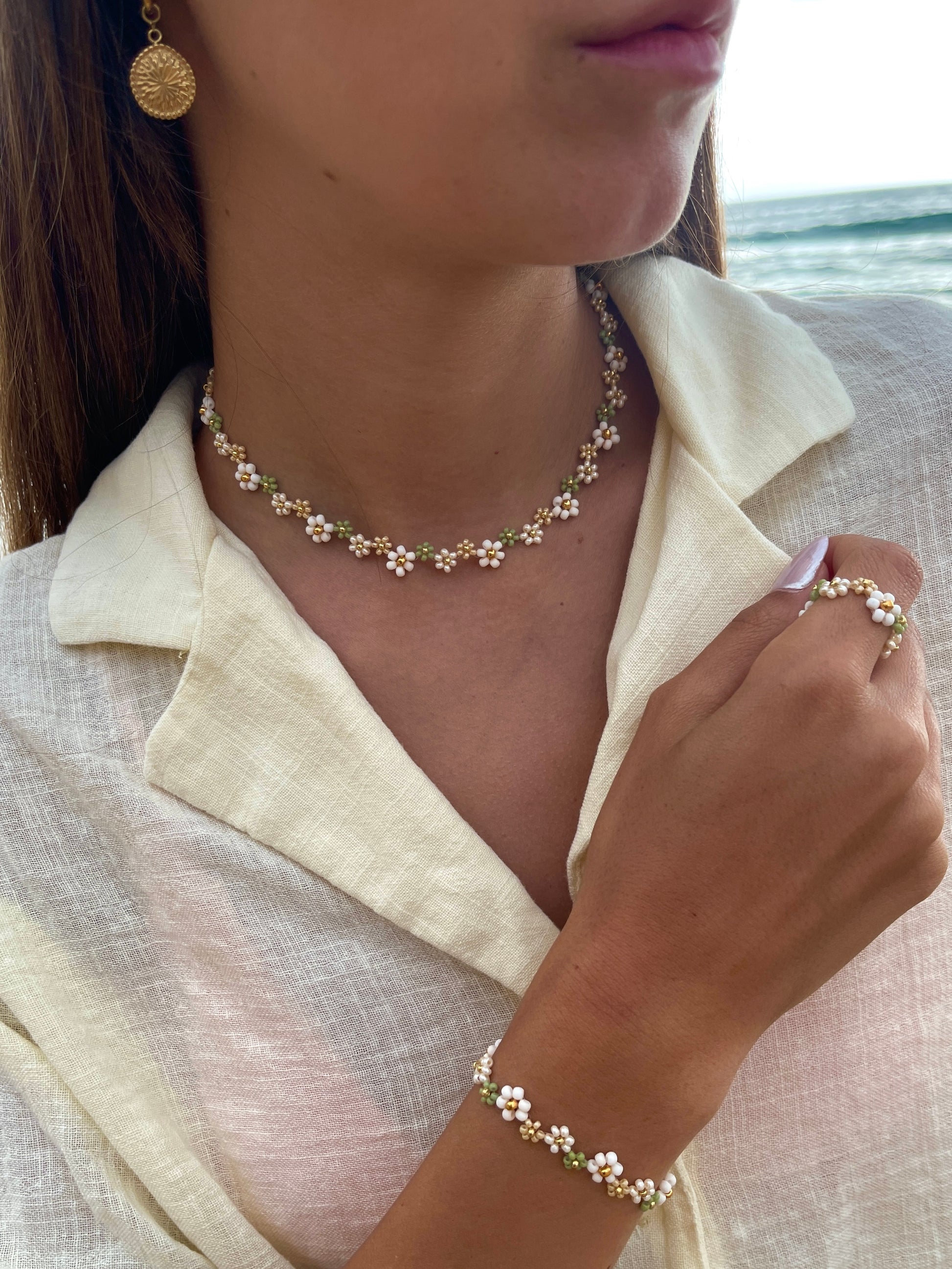 Die Ivy Kette mit ihren wunderschönen Perlen-Blumen in Naturtönen, ist perfekt für alle, die ein Akzent setzen möchten. Schmücke dich mit natürlichem Charme!