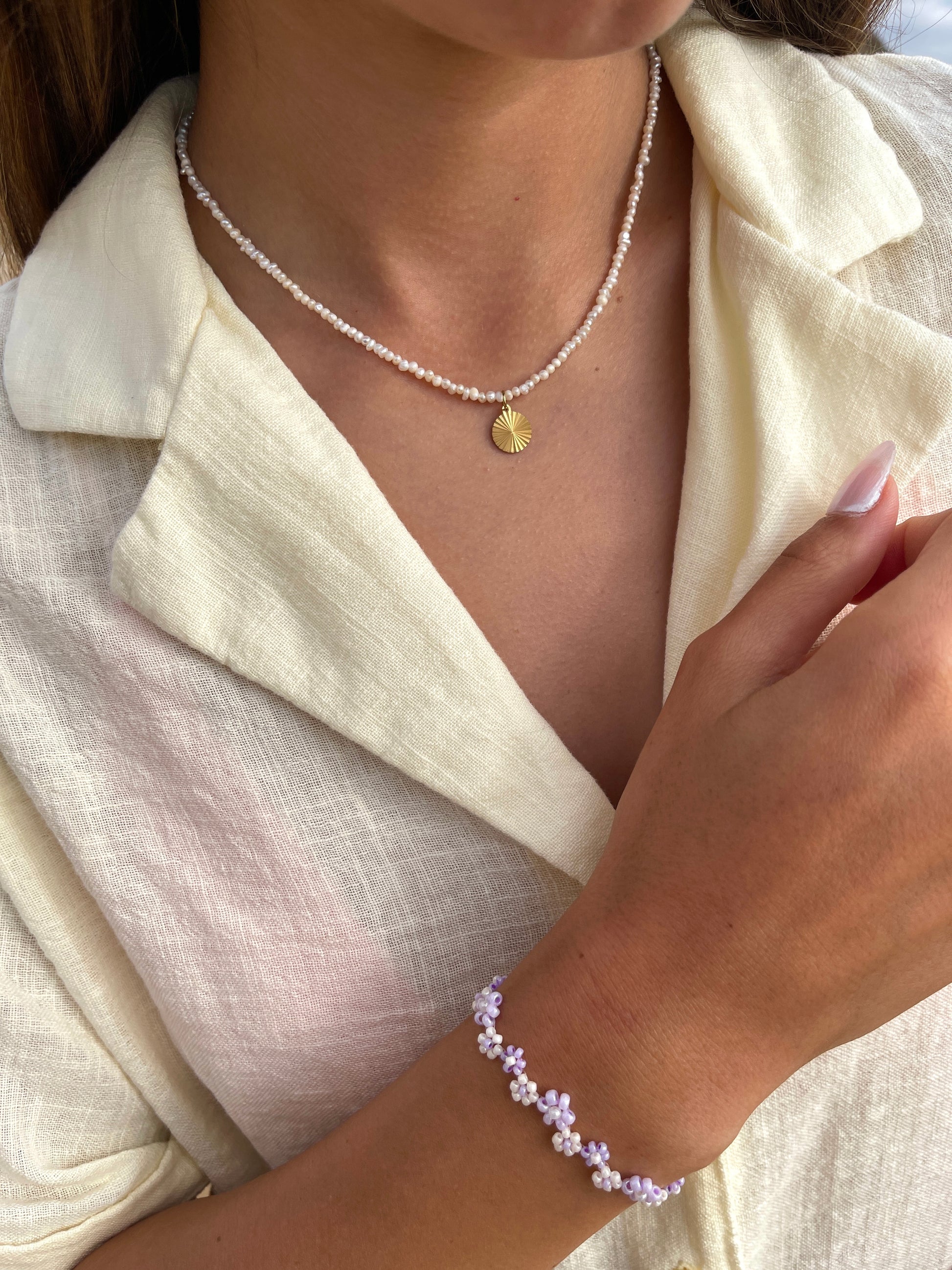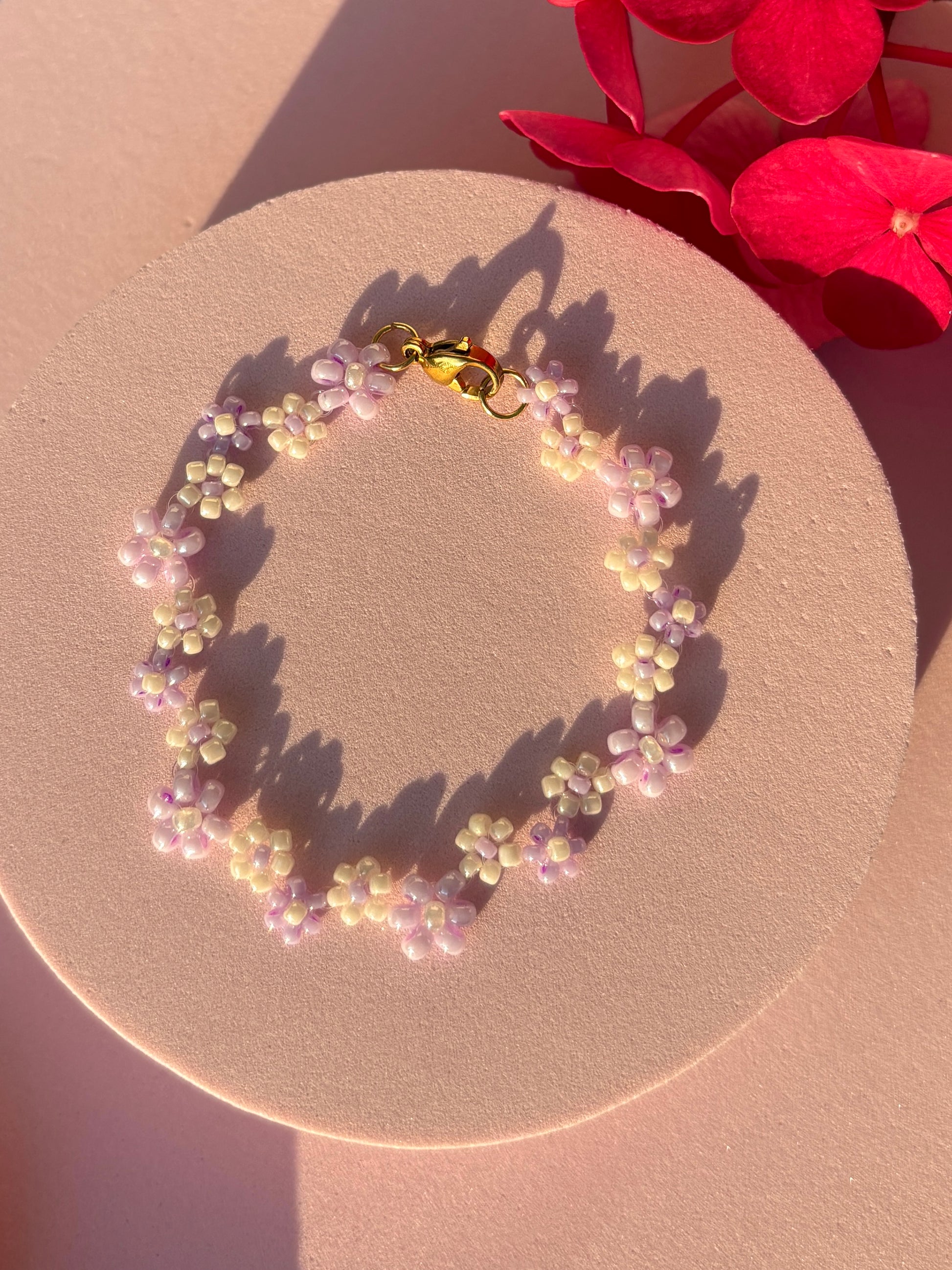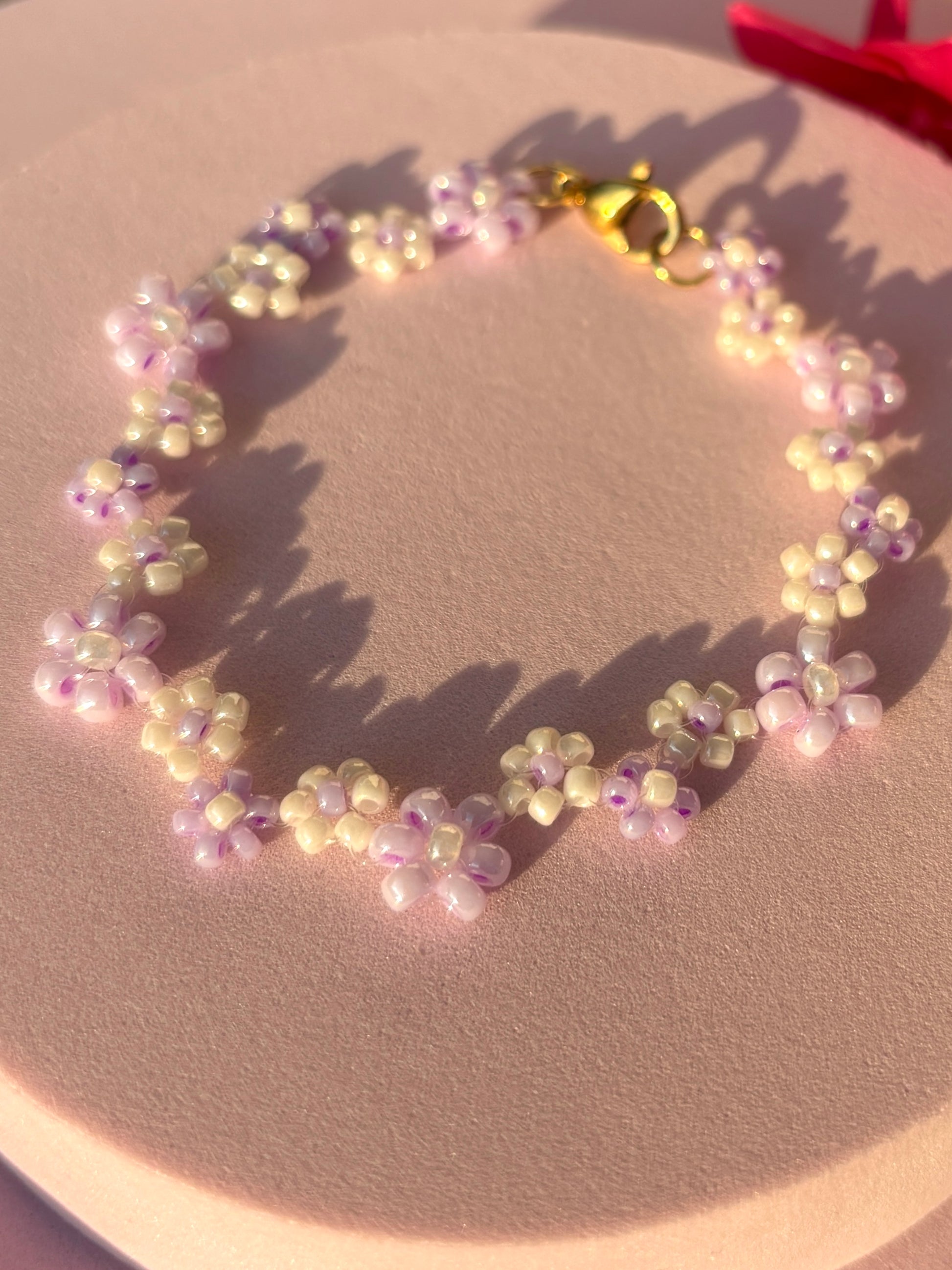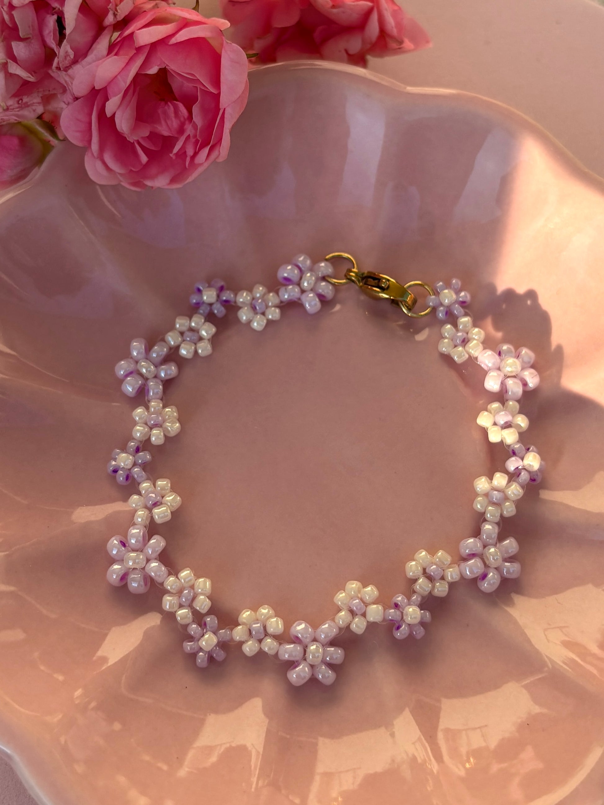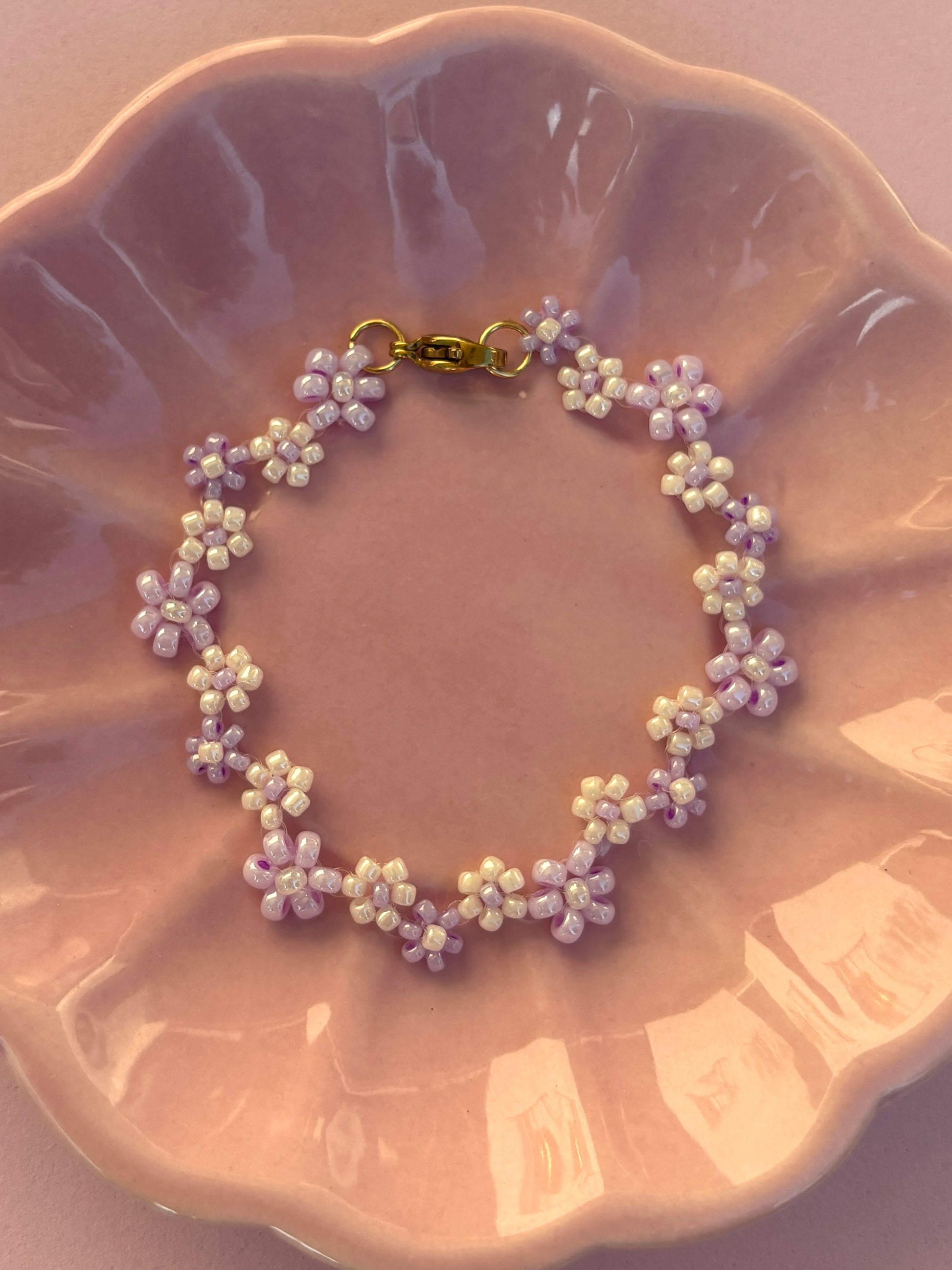 Verleihe deinem Outfit eine verspielte Note mit unserem Lavendel-farbenen Armband, verziert mit blumigen Details. Das perfekte Accessoire, um deinem Look eine frische und trendige Nuance zu verleihen. Ein Must-Have für alle Blumenliebhaber!