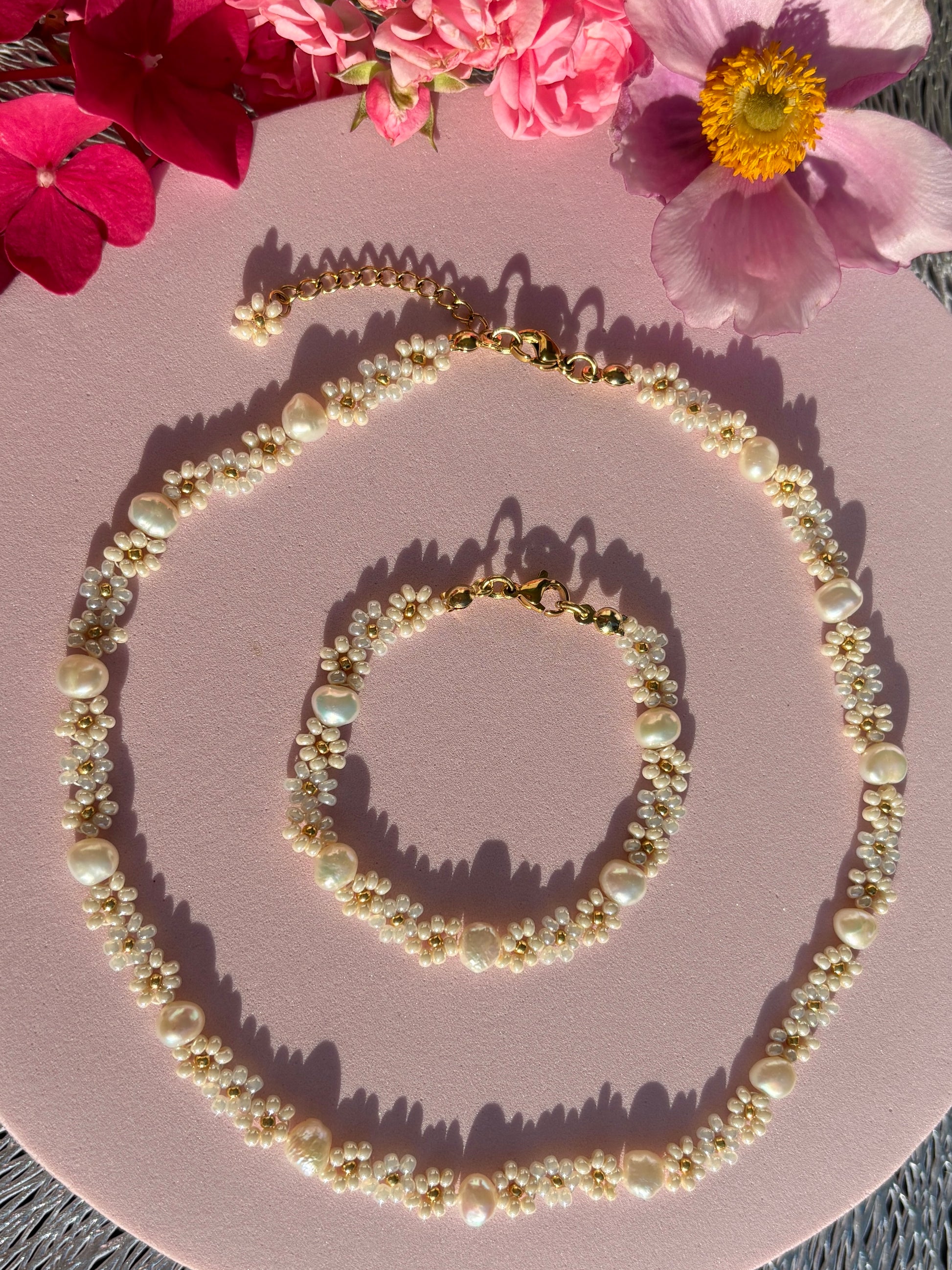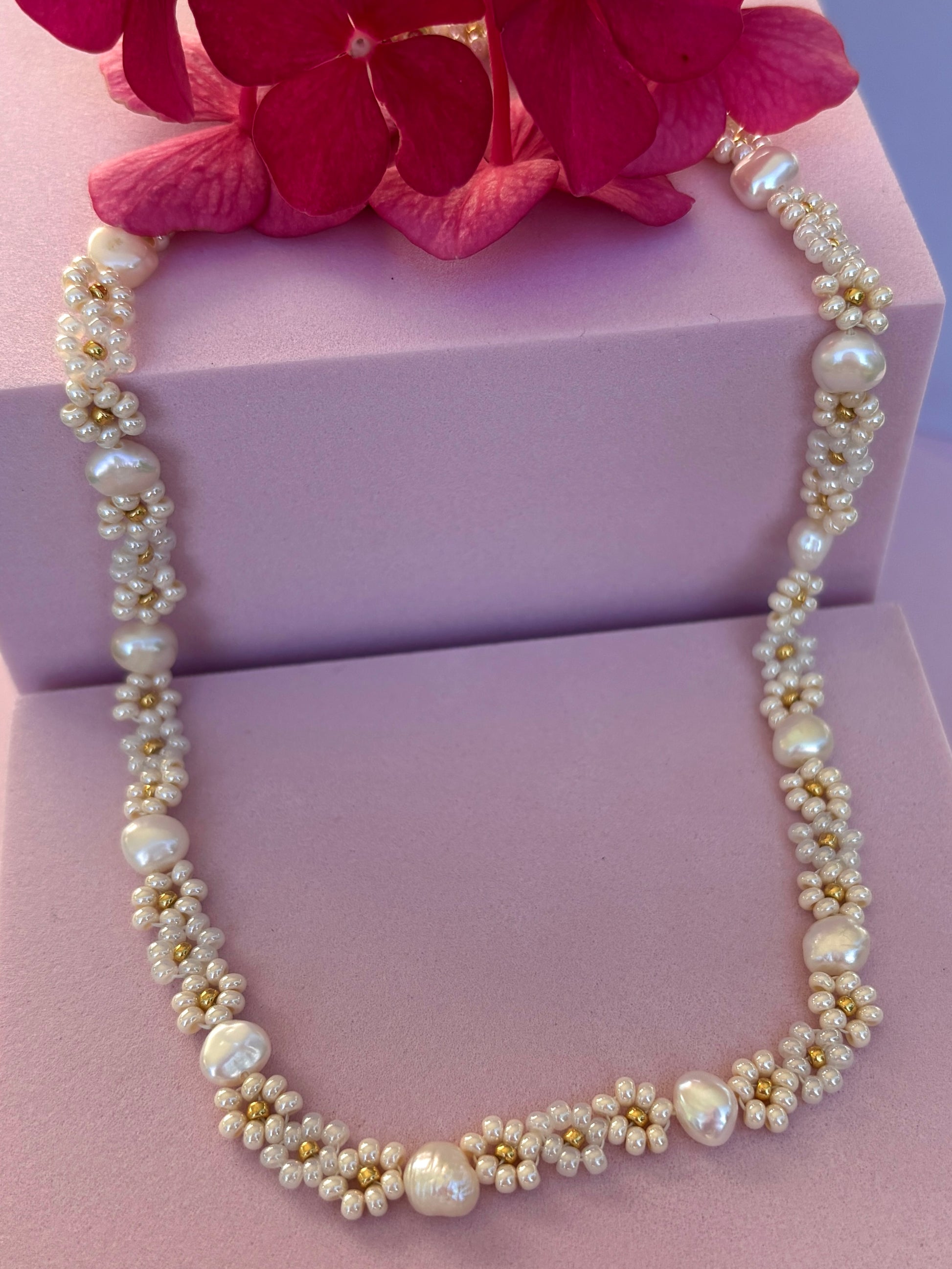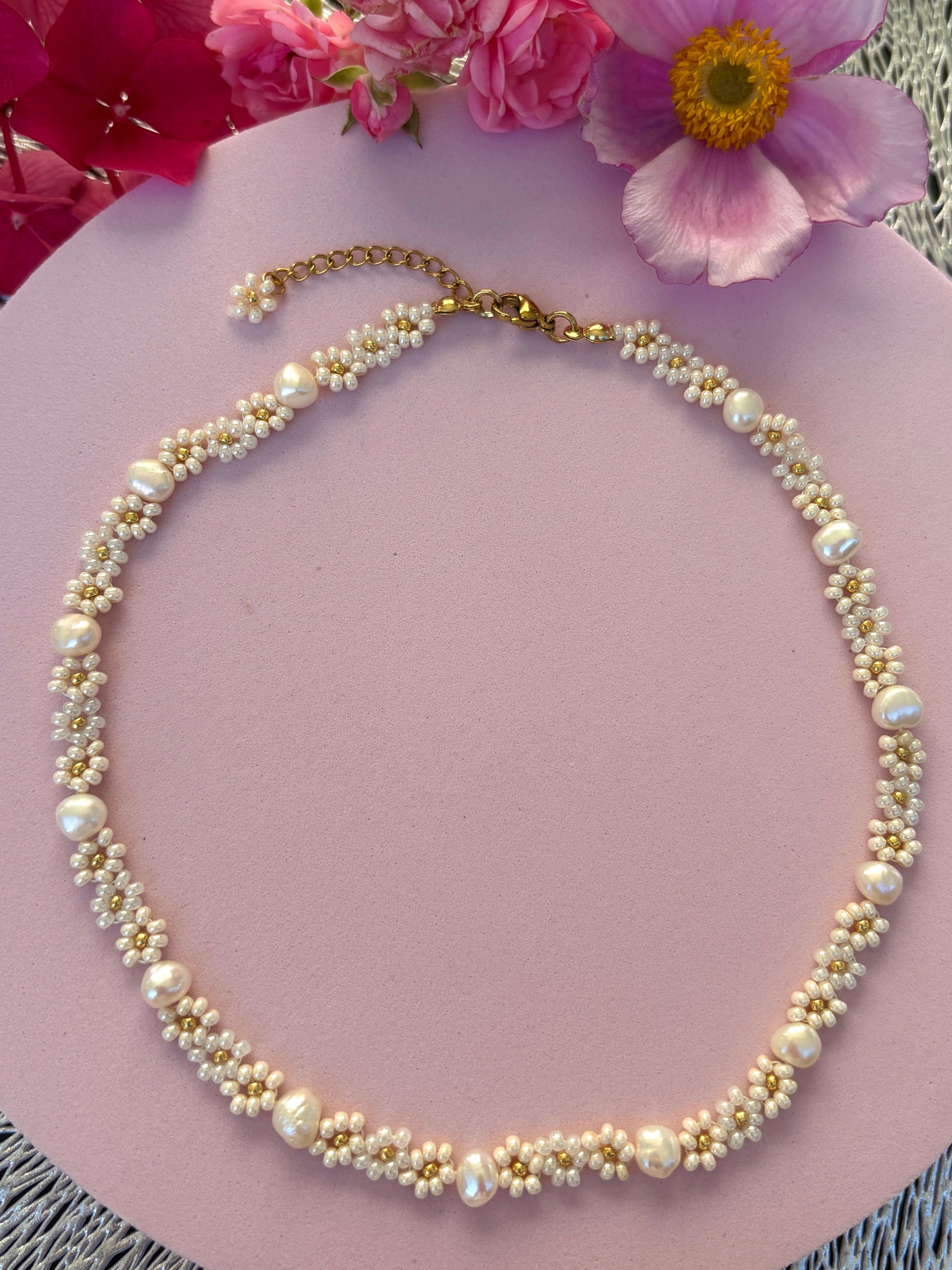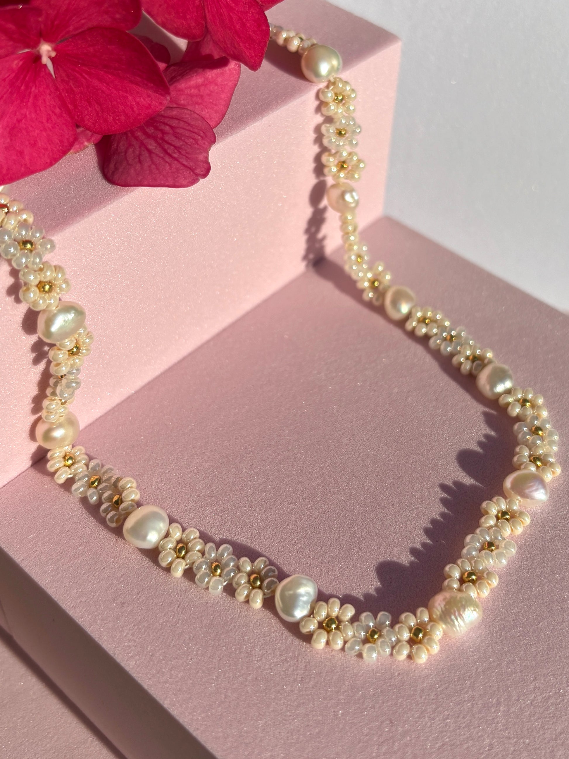 Mit der Malea Kette bist du immer am funkeln! Die zarten Blumen und Süßwasserperlen machen jedes Outfit einzigartig, egal ob alleine oder im Layering Look.