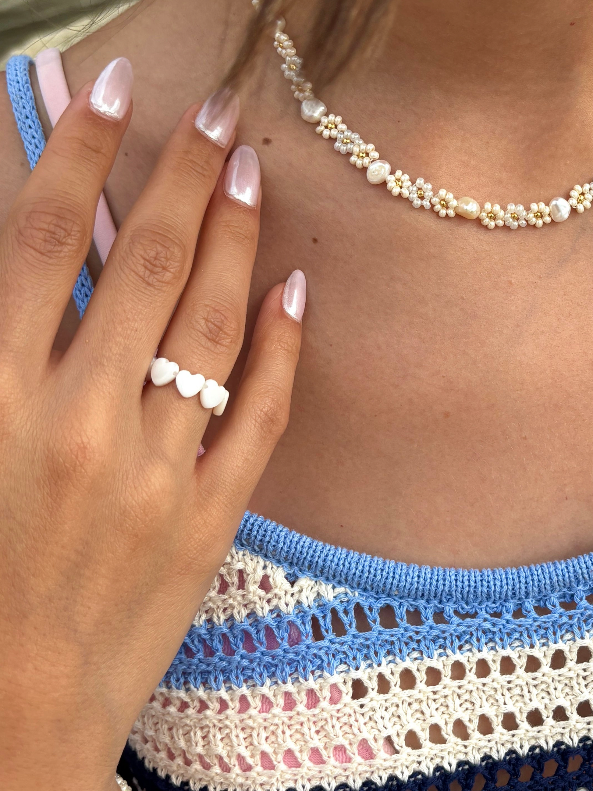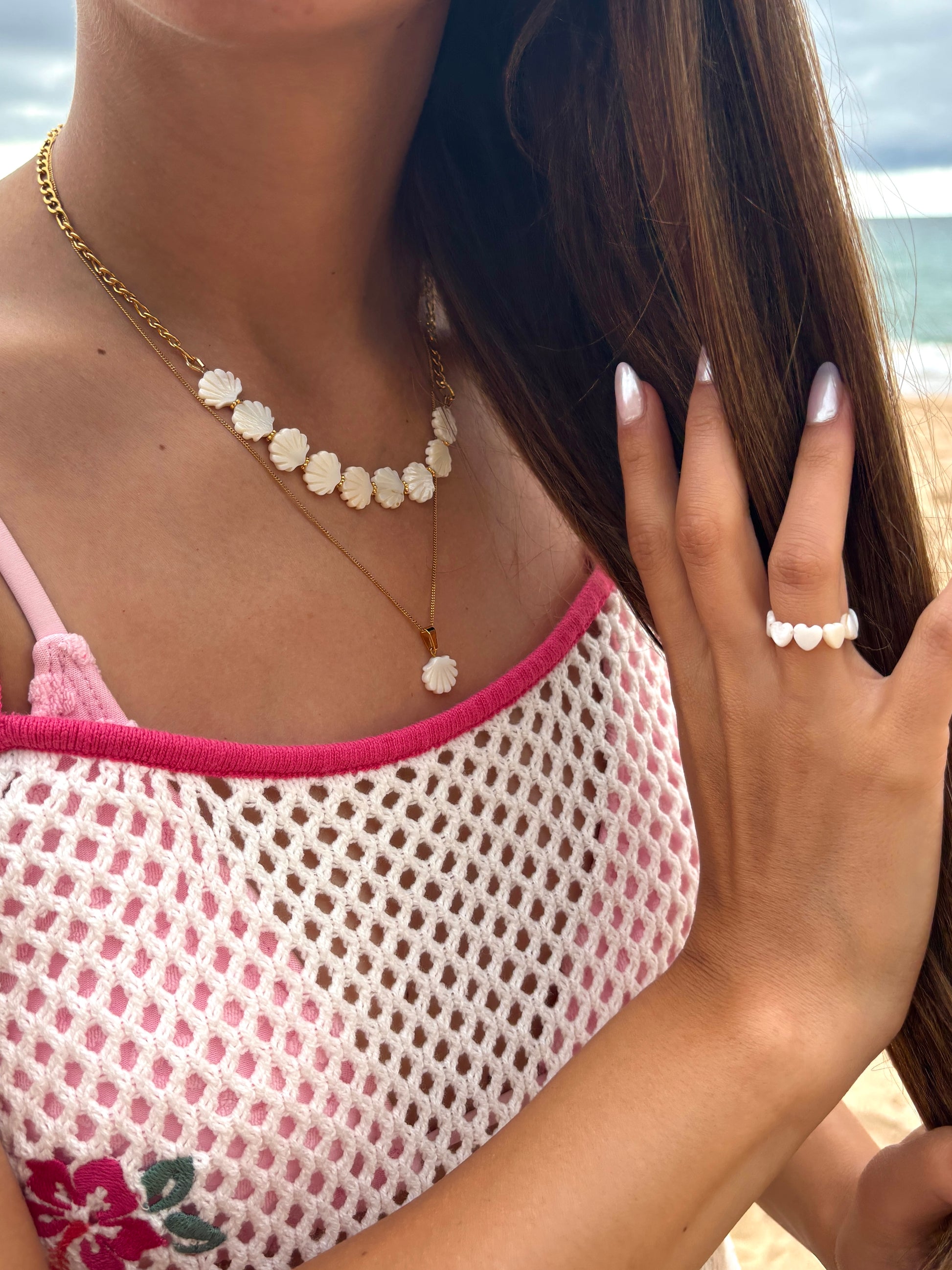 Dieser süße Ring besteht aus herzförmigen Muscheln und bringt eine liebevolle Note in jedes Outfit. Verwöhne dich mit diesem einzigartigen Schmuckstück!