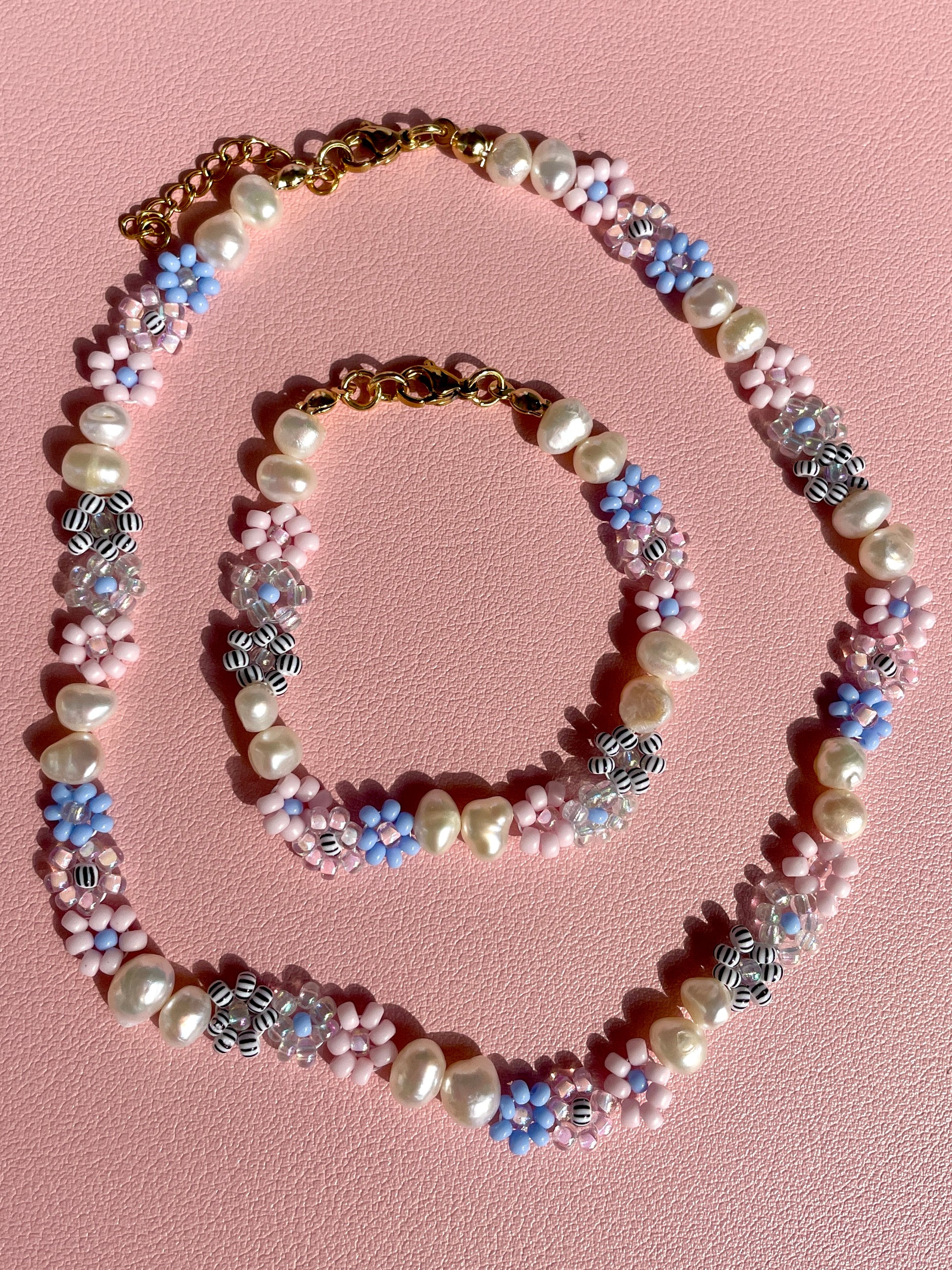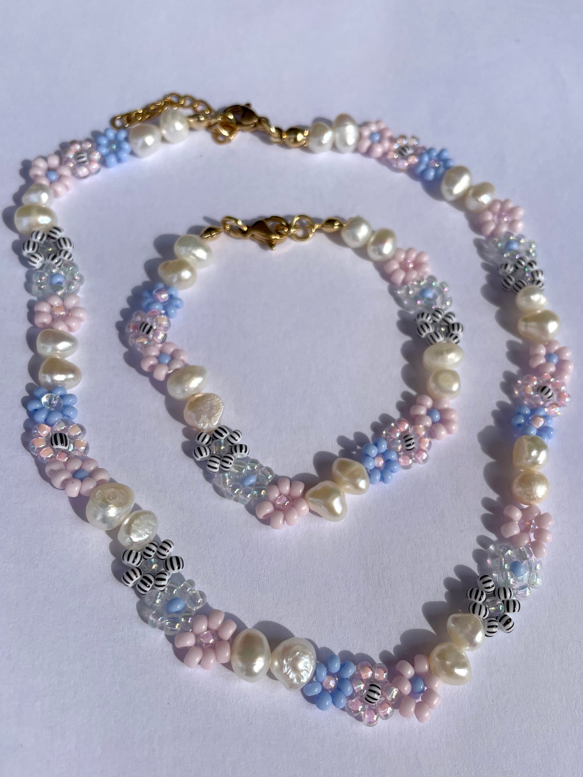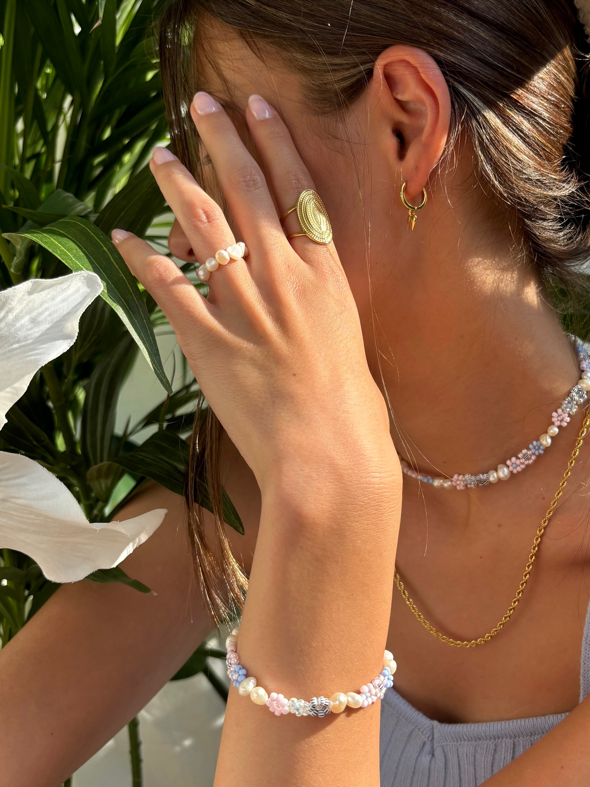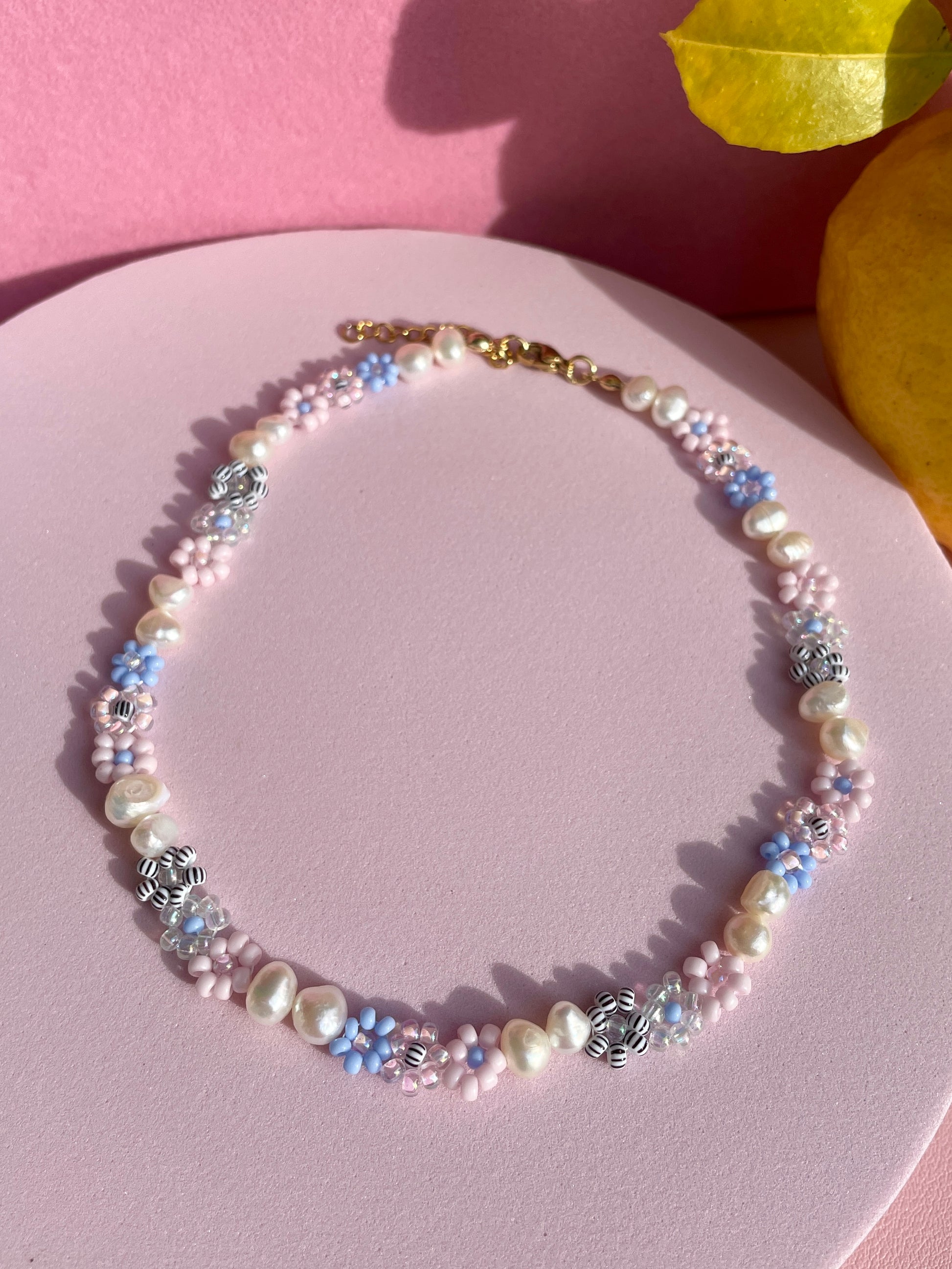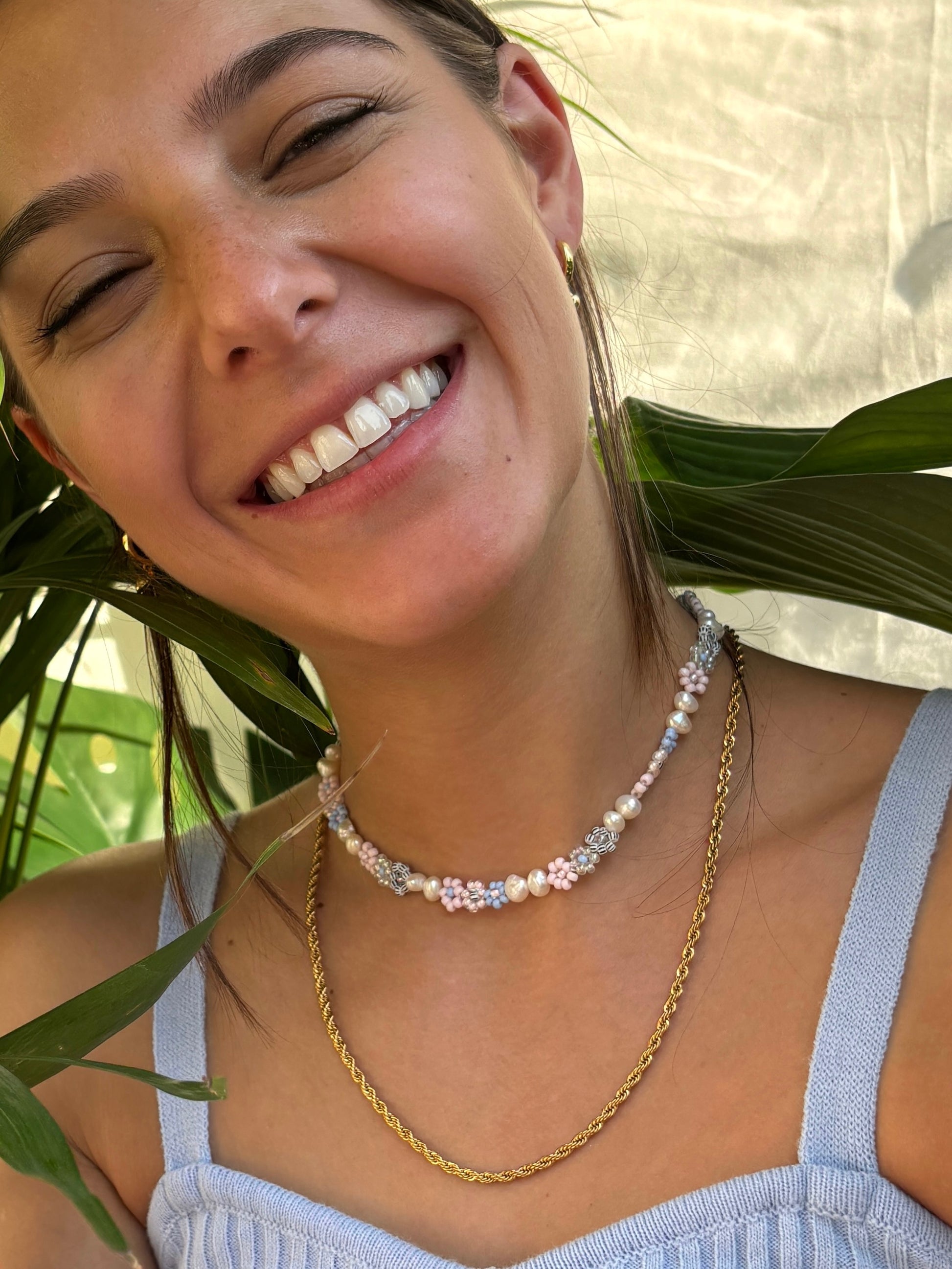 Erlebe den bezaubernden Look der Tiffany Kette aus Blumen und Süßwasserperlen. Die zarten Farben verleihen jedem Outfit einen verspielten Touch. Perfekt für den Frühling und Sommer und ein absolutes Must-Have für alle, die den Daisy Look lieben! 💕🌸